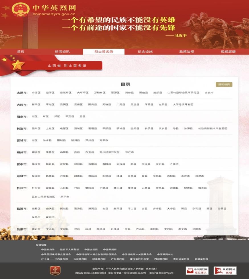 第二步:进入网页主页后,点击“烈士英名录”专栏,选择烈士所在区域,或在搜索栏直接输入烈士姓名。