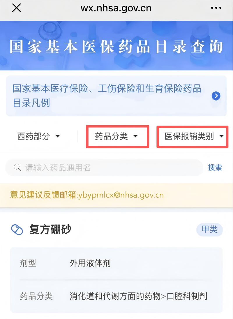 您也可以根据自己的需求,按“药品分类”或“医保报销类别”进行筛选查找。