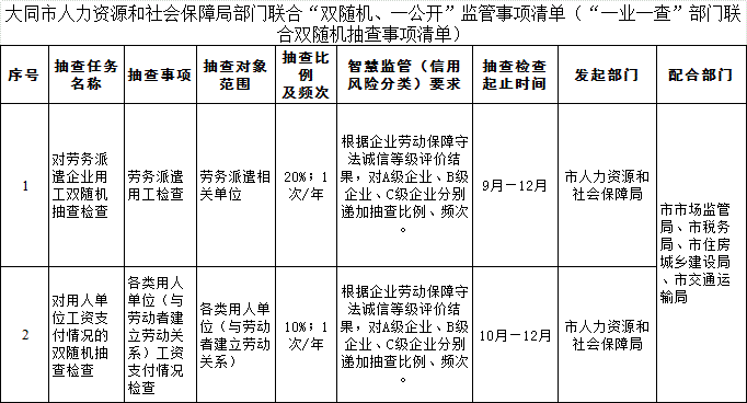 大同市人力资源和社会保障局部门联合“双随机、一公开”监管事项清单
