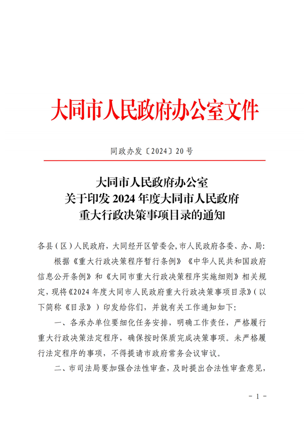 关于印发2024年度大同市人民政府重大行政决策事项目录的通知