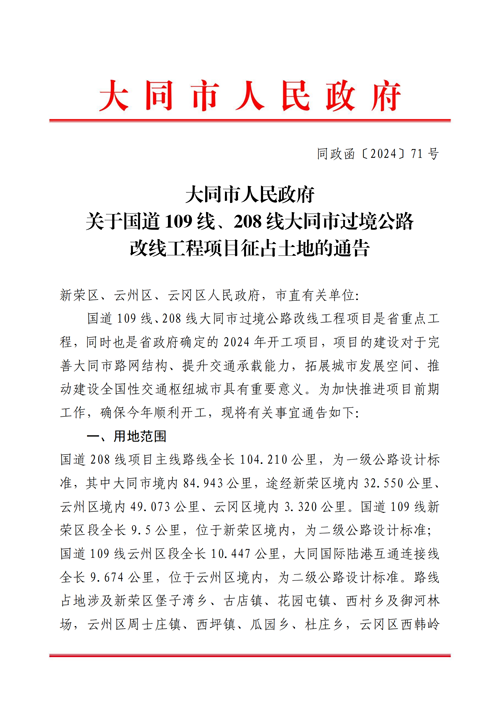 国道109线、208线大同市过境公路改线工程项目是省重点工程,同时也是省政府确定的2024年开工项目,项目的建设对于完善大同市路网结构、提升交通承载能力,拓展城市发展空间、推动建设全国性交通枢纽城市具有重要意义。为加快推进项目前期工作,确保今年顺利开工,现将有关事宜通告如下: