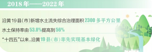 “治理黄河,重在保护,要在治理。”近年来,我省深入学习贯彻习近平生态文明思想,因地制宜推进沿黄流域生态建设,全力做好黄河流域生态保护大文章。数据显示:2018年至2022年,沿黄19县(市)新增水土流失综合治理面积2300多平方公里,水土保持率由53.8%提高到56%;“十四五”以来,沿黄19县(市)率先实现基本绿化。