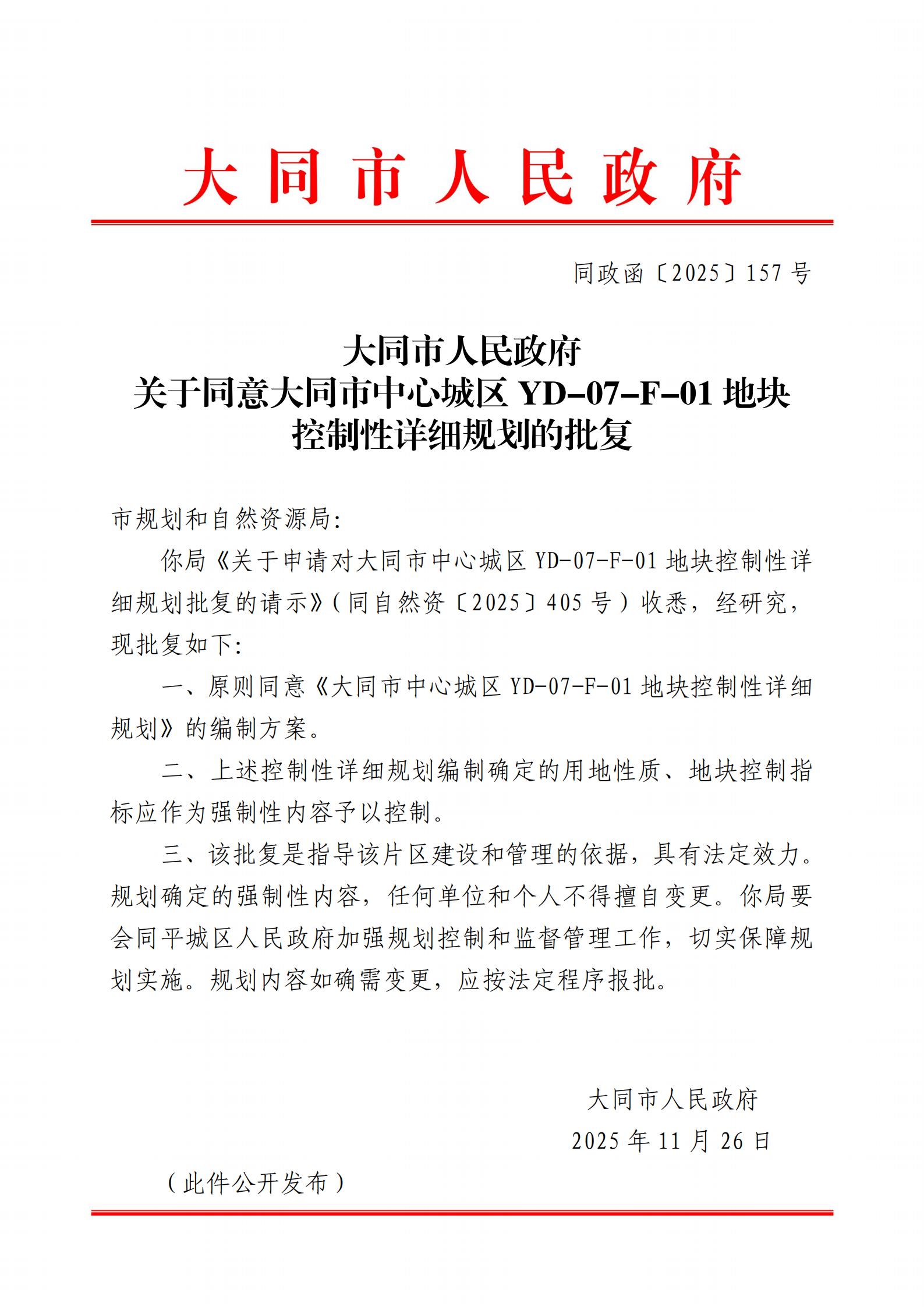 你局《关于申请对大同市中心城区YD-07-F-01地块控制性详细规划批复的请示》(同自然资〔2025〕405号)收悉,经研究,现批复如下: