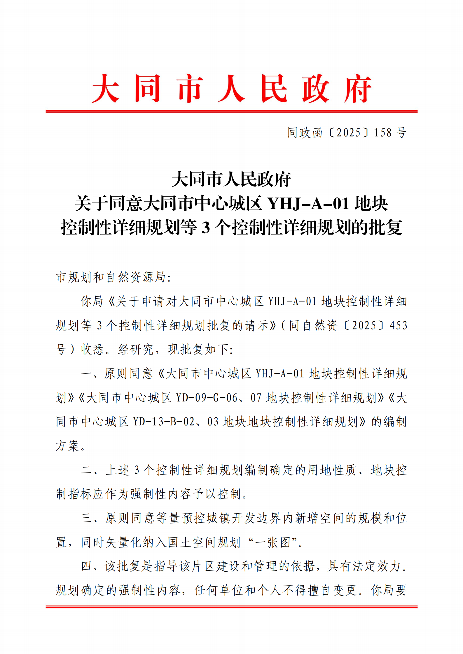 你局《关于申请对大同市中心城区YHJ-A-01地块控制性详细规划等3个控制性详细规划批复的请示》(同自然资〔2025〕453号)收悉。经研究,现批复如下: