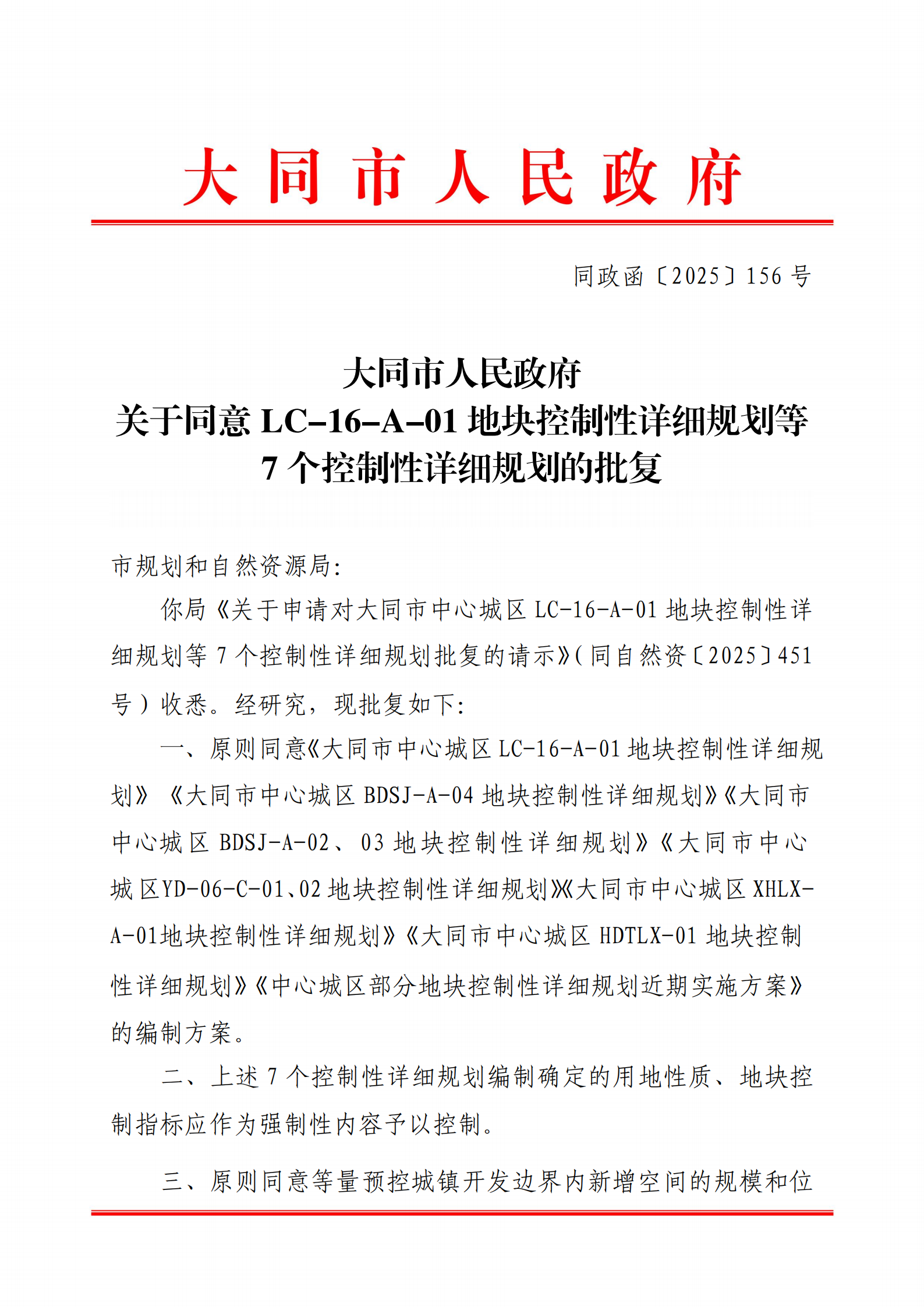 你局《关于申请对大同市中心城区LC-16-A-01地块控制性详细规划等7个控制性详细规划批复的请示》(同自然资〔2025〕451号)收悉。经研究,现批复如下: