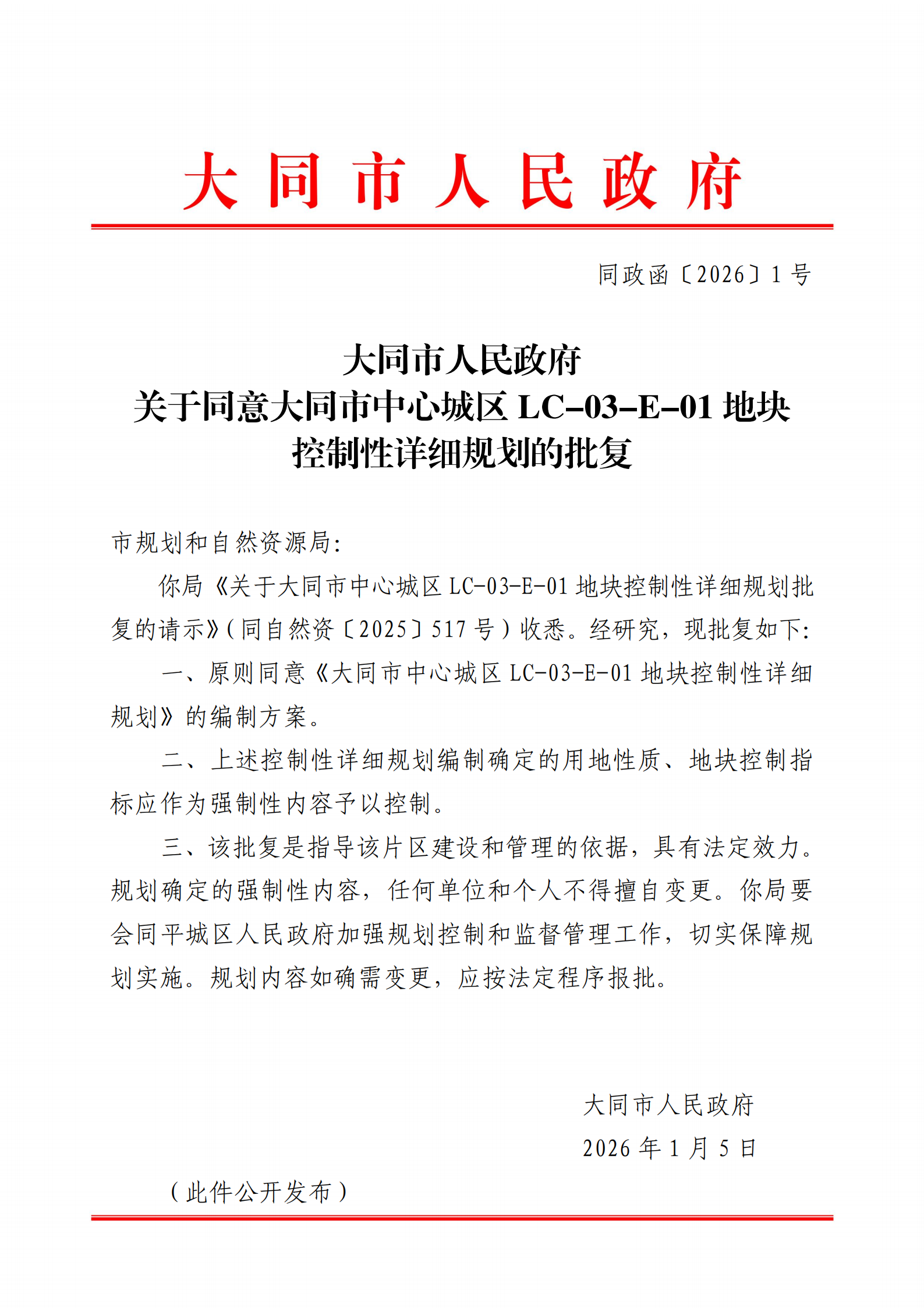 你局《关于大同市中心城区LC-03-E-01地块控制性详细规划批复的请示》(同自然资〔2025〕517号)收悉。经研究,现批复如下: