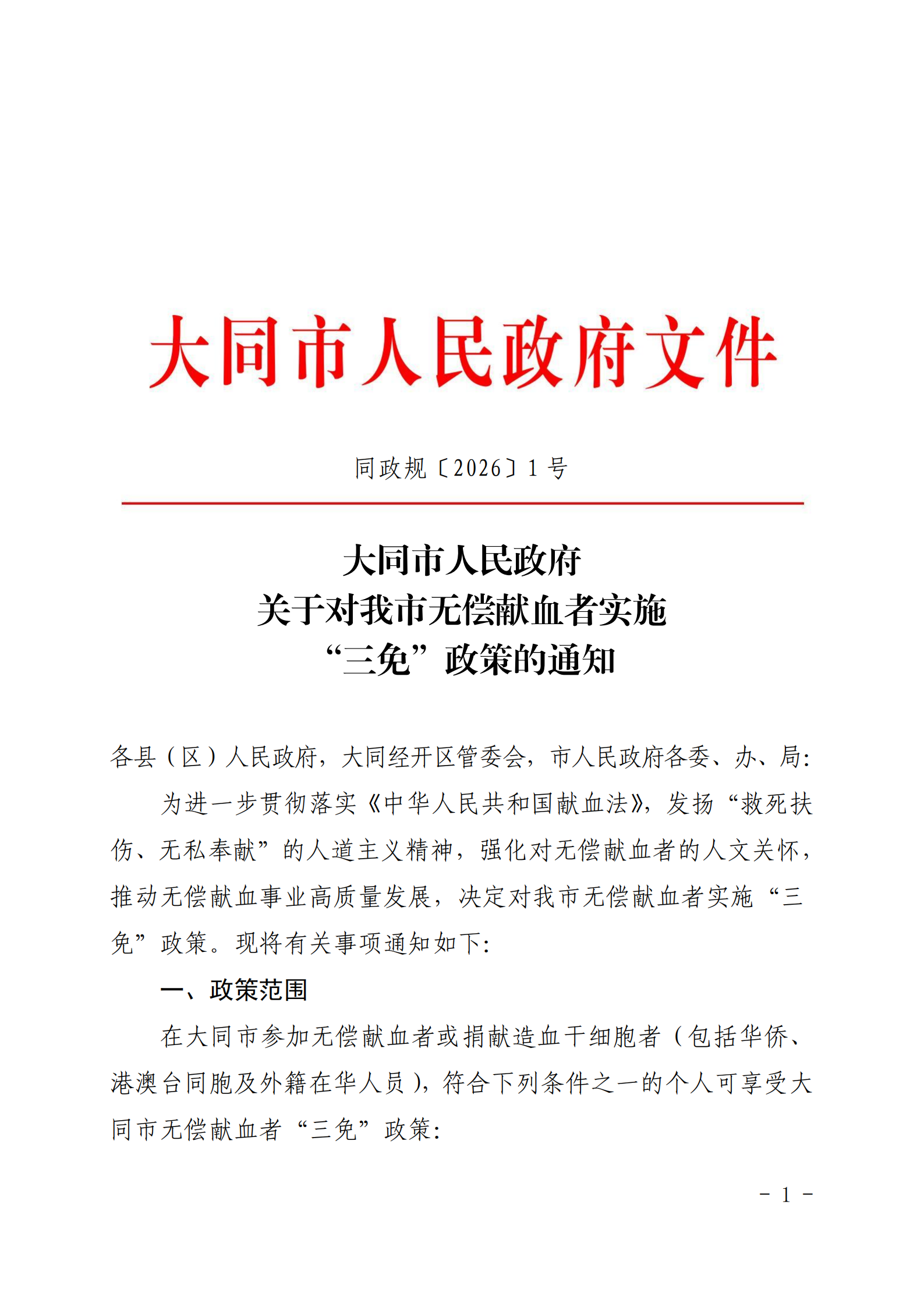 大同市人民政府关于对我市无偿献血者实施“三免”政策的通知